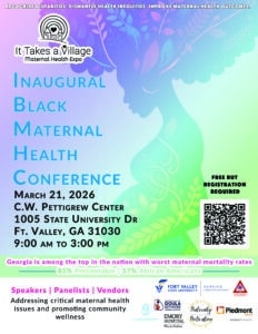 Join us for the Inaugural Black Maternal Health Conference on March 21, 2026, at Fort Valley State University. This free, community-focused event will bring together speakers, panelists, and vendors to address critical maternal health challenges, reduce disparities, and strengthen support for Black mothers and families across Georgia.